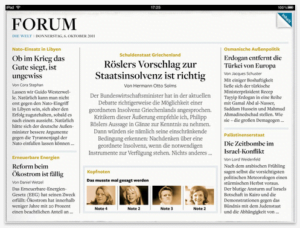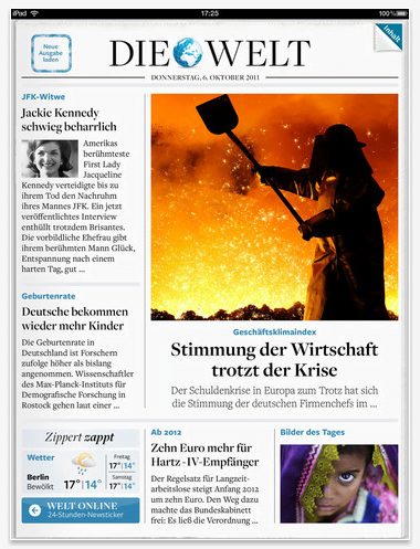 Die Installation der App geht wie gewohnt über den App-Store einfach von der Hand und man kann den Inhalt 30 Tage kostenlos testen, neben den klassischen Inhalten der Print-Ausgabe bietet das App noch weitere multimediale Inhalte wie z.B. Bildergalerien oder kleine Filme an. Da ich durch die Zeit die meine Tochter momentan noch benötigt stellenweise nicht einmal mehr in den Genuss der Tagesschau komme hilft mir das App mich über die Geschenisse aus aller Welt auf dem laufenden zu halten (Was macht eigentlich Gaddafi?).