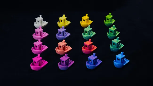 Statt nur harte Farbwechsel zu setzen, lassen sich so weichere Übergänge simulieren. Bambu zeigt das unter anderem mit mehreren unterschiedlich gefärbten Benchy-Modellen, die aus einem CMYK-Filament-Set erzeugt wurden.
