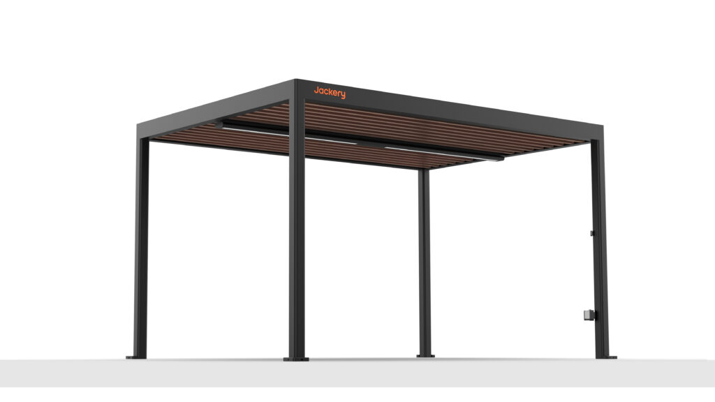 Im Mittelpunkt steht der Jackery Solar Gazebo, ein Gartenpavillon mit integrierten Solarmodulen. Das Konzept kombiniert Terrassenüberdachung und Photovoltaik in einem festen System. Auf dem Dach sind Module mit einer Gesamtleistung von 2.000 Watt verbaut. Unter günstigen Bedingungen sollen damit bis zu 10 kWh Strom pro Tag erzeugt werden können.