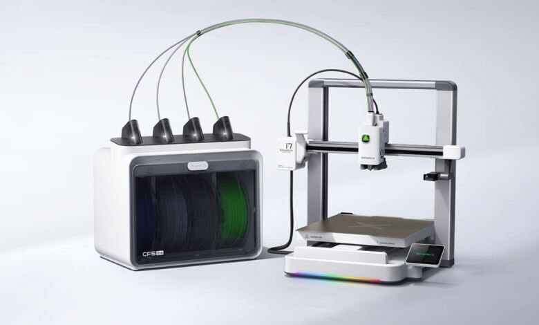 Optional unterstützt der SparkX i7 auch mehrfarbigen Druck mit bis zu vier Filamenten über das Zubehörmodul CFS Lite. Dieses System verwaltet die Filamente automatisch und reduziert laut Hersteller den Materialabfall bei Farbwechseln.