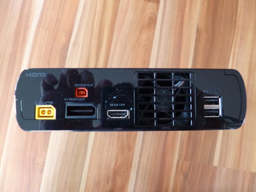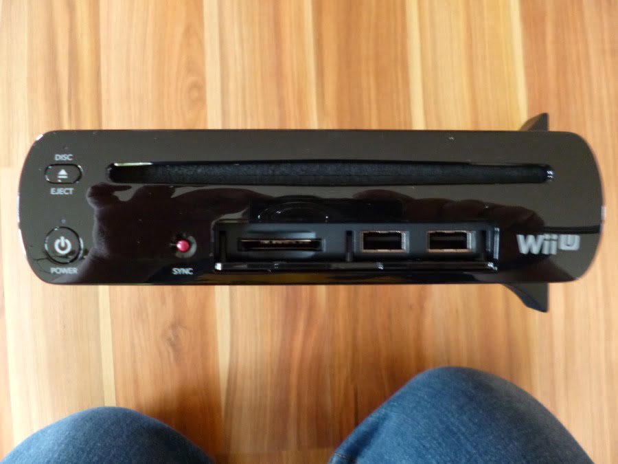 Meine Konsole besteht aus schwarzem Kunsstoff, auf der Frontside befindet sich der Schlitz des Slot-In Laufwerks, der Power Button, eine Status LED (rot=aus, blau=an), ein Eject- und ein Sync-Knopf, hinter der mechanischen Klappe befindet sich ein SD-Kartenslot (um Spielstände abzuspeichern) und 2 USB-Ports (wohl für zusätzliche Controller). Ob der SD-Kartenslot auch zum importieren von Medien (Bilder, Filme, Musik) verwendet werden kann werde ich in einem späteren Bericht testen, ebenso ob über die USB-Ports weitere ext. Datenträger angeschlossen werden können.