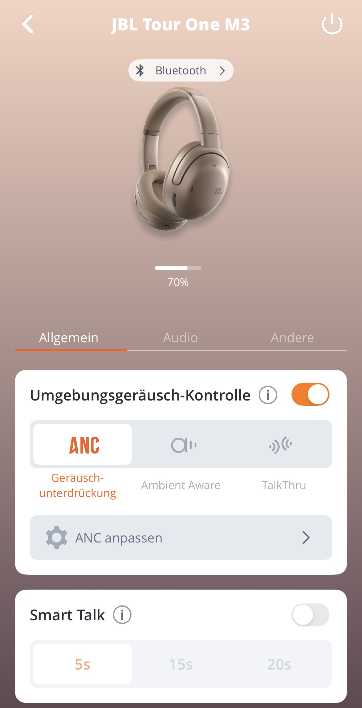Die Bedienung kombiniert physische Tasten mit Touch-Gesten und zeigt sich im Alltag erfreulich unproblematisch. Lautstärke, ANC-Modi und der Power-Schalter sind haptisch klar getrennt, was Fehleingaben angenehm reduziert. Sollte man dennoch vergessen, den Kopfhörer auszuschalten, greift eine automatische Abschaltfunktion. Nach einer frei wählbaren Zeit (bis zu zwei Stunden) ohne Nutzung schaltet sich der Tour One M3 selbstständig ab, ohne den Akku unbemerkt zu leeren. Apropos Akku: JBL gibt bis zu 70 Stunden Laufzeit ohne aktive Geräuschunterdrückung an, mit ANC sind realistisch etwa 30 bis 40 Stunden möglich – je nach Lautstärke. In der Praxis reicht das problemlos für Langstreckenflüge oder mehrere Arbeitstage. Eine Schnellladefunktion sorgt zudem dafür, dass schon zehn Minuten am Kabel mehrere Stunden Wiedergabe ermöglichen, während eine vollständige Ladung rund zwei Stunden benötigt.