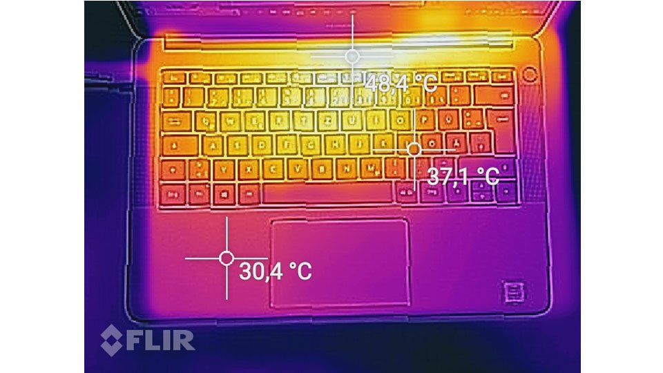 Im Stresstest erwärmte sich das kleine Notebook von Huawei auf beiden Seiten. Im hinteren Bereich der Tastatur konnte die Wärmebildkamera einen Hotspot von 48,4 Grad Celsius ausmachen. Der Rest der Tastatur erwärmte sich kaum. Ein ähnliches Bild zeigte die Wärmebildkamera auf der Unterseite. Auch hier konnten wir nur im hinteren Bereich einen heißen Hotspot von 47,1 Grad messen.