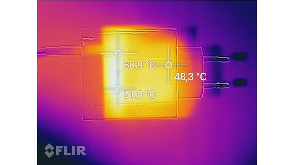 Die Verlustleistung der inneren Hardware wird hauptsächlich nach hinten abgeleitet. Dort wurden Temperaturen über 52 Grad gemessen. Das Belüftungssystem war im Stresstest nur unmittelbar am Gerät hörbar. Der kleine Ladeadapter wurde im Stresstest auch etwas heißer. Die Messungen zeigten bis zu 51,9 Grad Celsius an.