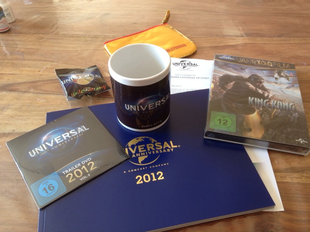 Alles kommt wohl zusammen und viel Zeit für das bloggen belibt nicht wirklich, obwohl man mein tun hier wohl nicht unbedingt als „wertvoll“ einstufen kann. Ich geb keine Tipps zu irgendwelchen aktuellen Themen oder bin ein Spezialist für irgenendwas, ich bin einfach da, hinterlasse allerdings keine Abdrücke in der großen weiten Welt des Internets. Immerhin hat es meine Seit geschafft, jetzt einen PR von 1 zu bekommen, was immerhin ein kleiner Ansporn hier doch weiterzumachen. Auch hat es den Anschein, als ob ich langsam gefunden werde, die letzte Woche kam zumindest ein Paket adressiert an den Pixelaffen. Darin befand sich ein Überraschungspaket von Universal mit dem 100 Jahre Film gefeiert werden soll. Inhalt war neben der digital überarbeiteten Fassung von King Kong noch ein Booklet und eine Trailer DVD mit dem aktuellen Programm von Universal. Dazu gab es Gummibärchen und eine personalisierte Kaffeetasse. Über das beiliegende goldene Handtäschlein hat sich meine 11 Monate alte Tochter gefreut. Doch es waren nicht die Goodies über die ich mich gefreut habe, es war das erste mal, dass ich etwas dafür bekommen habe, den Blog hier zu schreiben, bzw. etwas für den Blog bekommen über das ich schreiben kann.