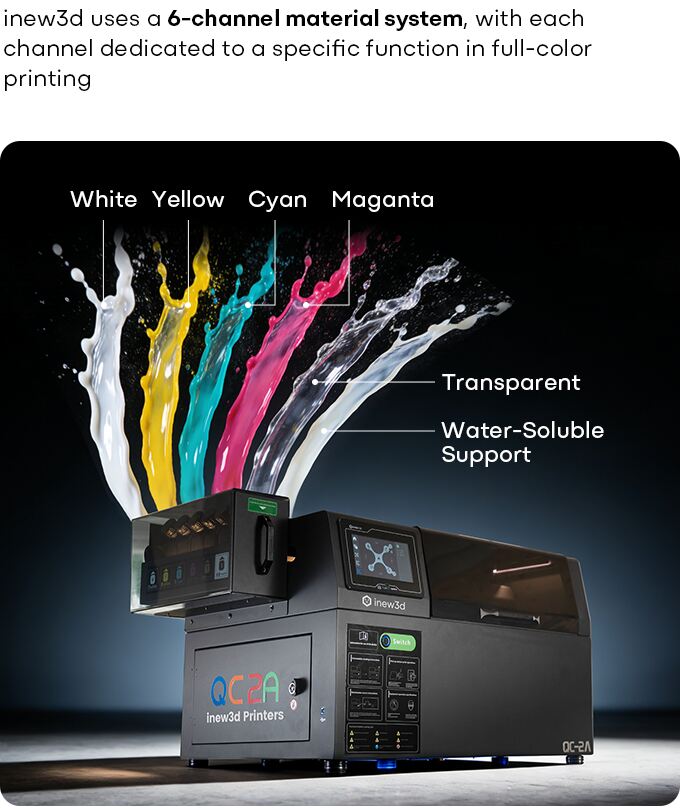 Technisch setzt der QC2A nicht auf klassischen Filamentdruck, sondern auf ein Material-Jetting-Verfahren mit Photopolymeren. Dabei werden farbige Harze in mikroskopisch kleinen Tröpfchen aufgetragen und anschließend per UV-Licht ausgehärtet. Der Hersteller verspricht dadurch echte Vollfarbdrucke mit fließenden Farbverläufen direkt im Bauteil. Das ist ein klarer Unterschied zu vielen bekannten Multicolor-FFF-Systemen, die Farben meist nur über Filamentwechsel kombinieren, aber keine feinen Übergänge im selben Maßstab erzeugen.