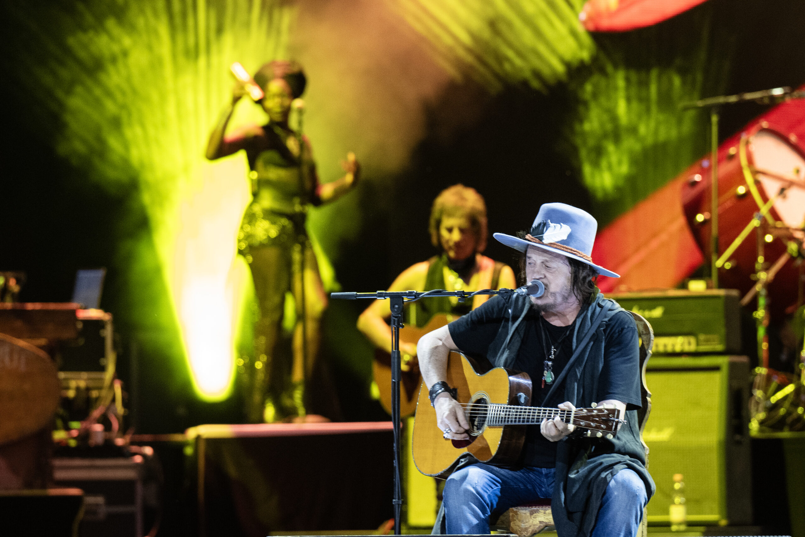 Das rockig-popige kraftvolle „Baila“ versetzt den Innenraum in rhythmische Wallung, seine Spielfreude greift sozusagen auf das Publikum um. Zwischendurch sitzt Zucchero mit Klampfe im Arm wie ein nachdenklicher Maestro auf einem goldenen Stuhl am vorderen Bühnenende. Er spricht mit dem Publikum, teils auf Englisch, mit ironischem Charme: „I keep singing in Italy“, sagt er augenzwinkernd. Als ein Mitschnitt von Luciano Pavarotti zu „Miserere“ eingespielt wird, liegt eine besonders emotionale Stimmung über dem proppevollen Platz. Es wird leise. Bewegte Gesichter, sogar die ein oder andere Träne kullert. Danach eine Pause für ihn – überbrückt mit einem Tina Turner-Cover von „Night Bush City Limits“, bei dem seine Band glänzen darf. Gerade seine Gesangspartnerin Oma Jali liefert hier ein energiegeladenes Bit ab, wie man weder erwartete oder vorausahnen konnte. Ganz ohne den Altmeister ein Highlight der Show.