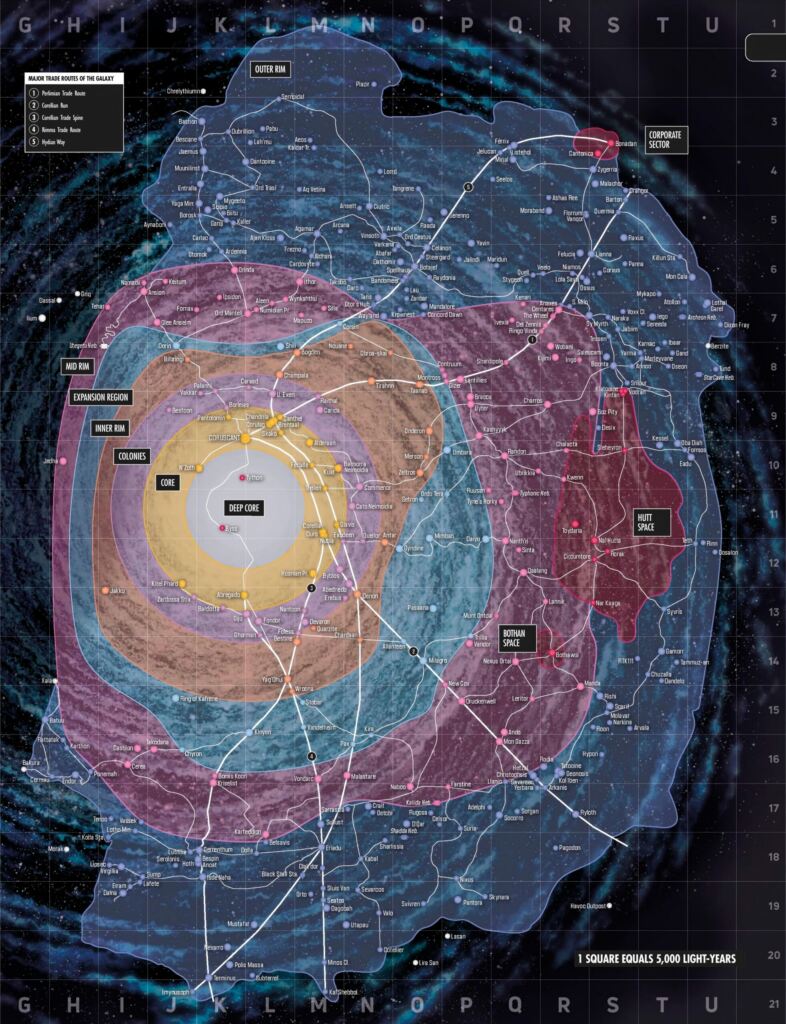 Das Franchise ist über Jahrzehnte und über viele Medien hinweg gewachsen: Filme, Serien, Spiele, Bücher und Comics haben ständig neue Orte ergänzt. Die Karte bündelt die Galaxie in einer zentralen Übersicht und macht sichtbar, wie groß das erzählerische Spielfeld von Lucasfilm inzwischen geworden ist.