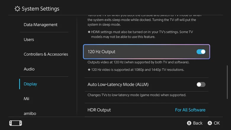 Die wohl spannendste Option steckt im Display-Menü der Switch 2. Dort lässt sich die 120-Hz-Ausgabe aktivieren. Nintendo bestätigt offiziell, dass die Konsole Bildausgabe mit bis zu 120 fps bei 1080p und 1440p unterstützt. In 4K ist dagegen bei 60 fps Schluss. Das ist wichtig, weil manche Berichte den Eindruck erwecken, 120 fps seien generell auf allen Ausgabemodi drin. Das stimmt so nicht.
