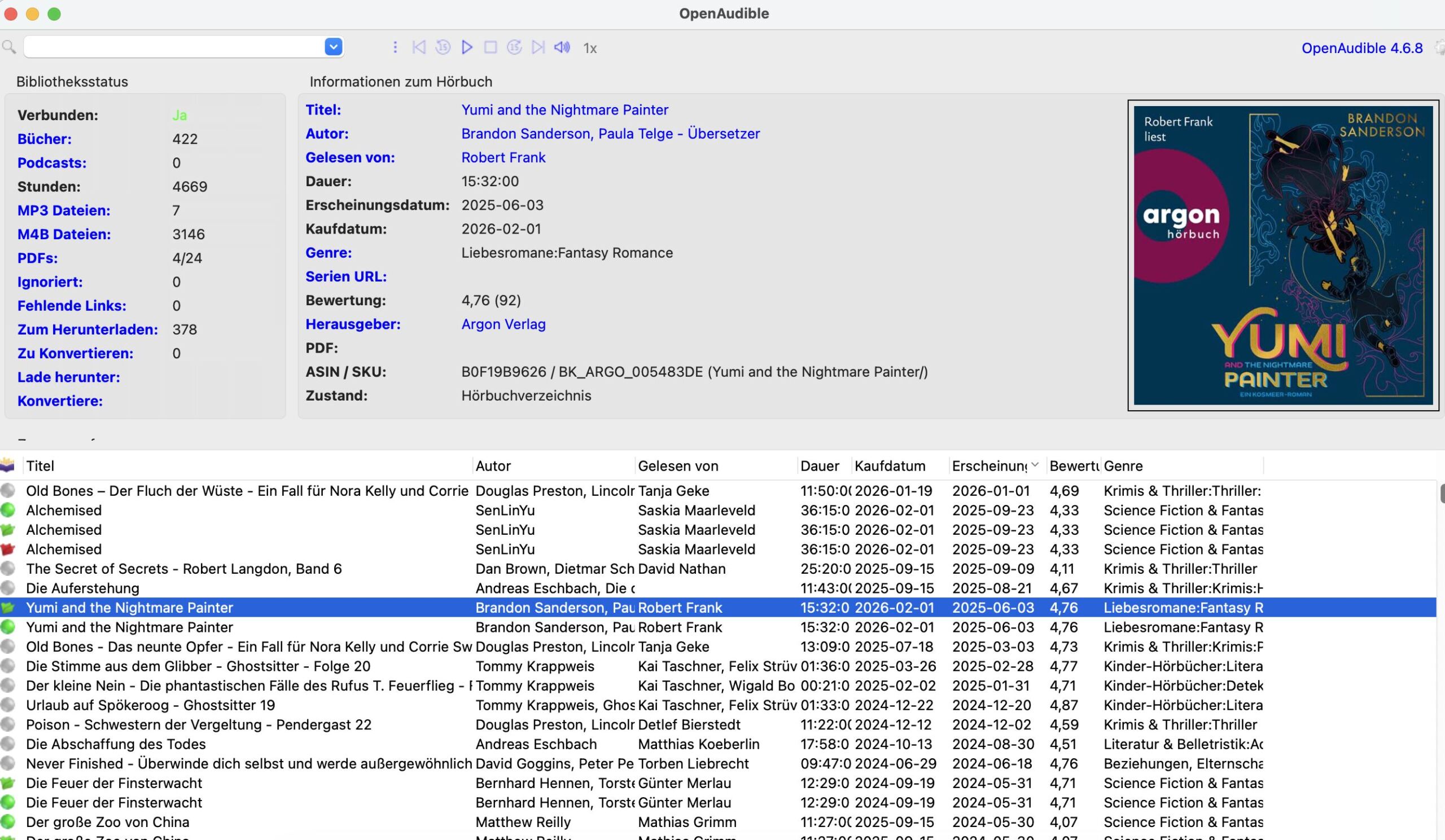 - Jetzt markiert man das gewünschte Hörbuch in der Bibliothek und startet die Umwandlung. Nach der Konvertierung zeigt OpenAudible den Status als erfolgreiches MP3- oder M4B-Buch an.