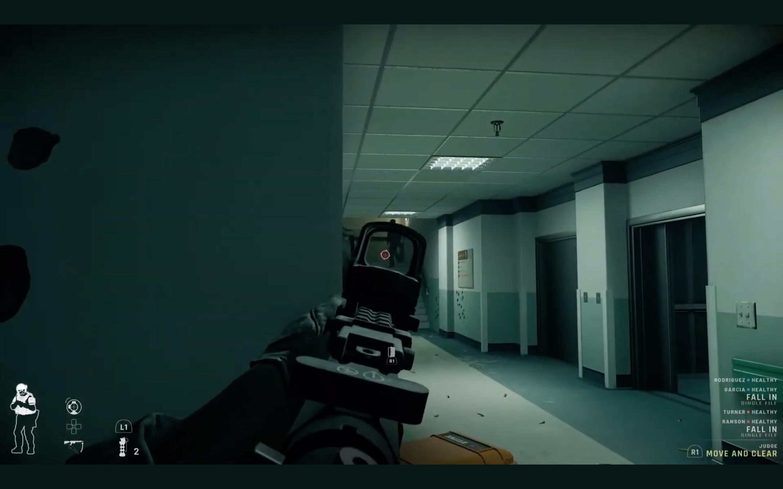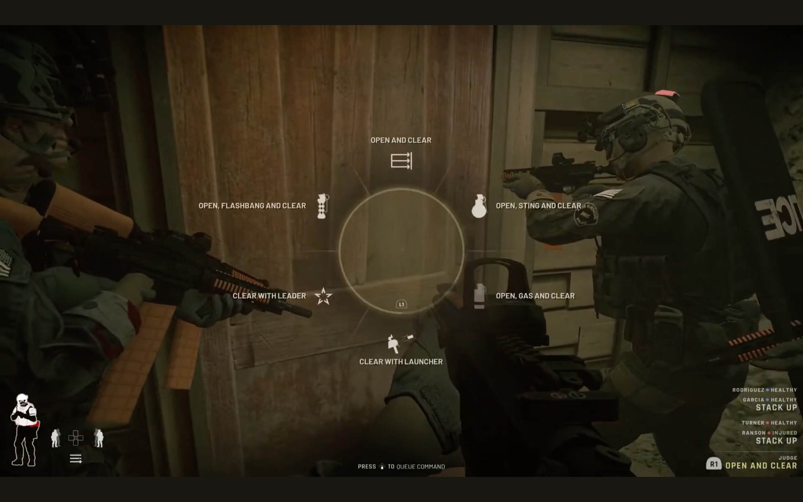 Angeführt wird das Team von David Beaumont, Rufname Judge, dem Commander des D Platoon der LSPD-Spezialeinheit. Mit vier KI-Begleitern zieht man in die Einsätze – und muss ihnen nahezu jeden Schritt vorgeben. Über ein eher rudimentäres Befehlsrad können Spieler ihre Leute stapeln lassen, bestimmte Türseiten sichern, die Art des Eindringens festlegen oder anordnen, dass vor dem Sturm eine Blendgranate geworfen wird. Präzise, aber umständlich: In den ersten Stunden kämpft man häufig mehr mit dem Menü als mit den Gegnern. Hat man sich jedoch eingearbeitet, lassen sich Raum für Raum regelrechte Choreografien abspulen.