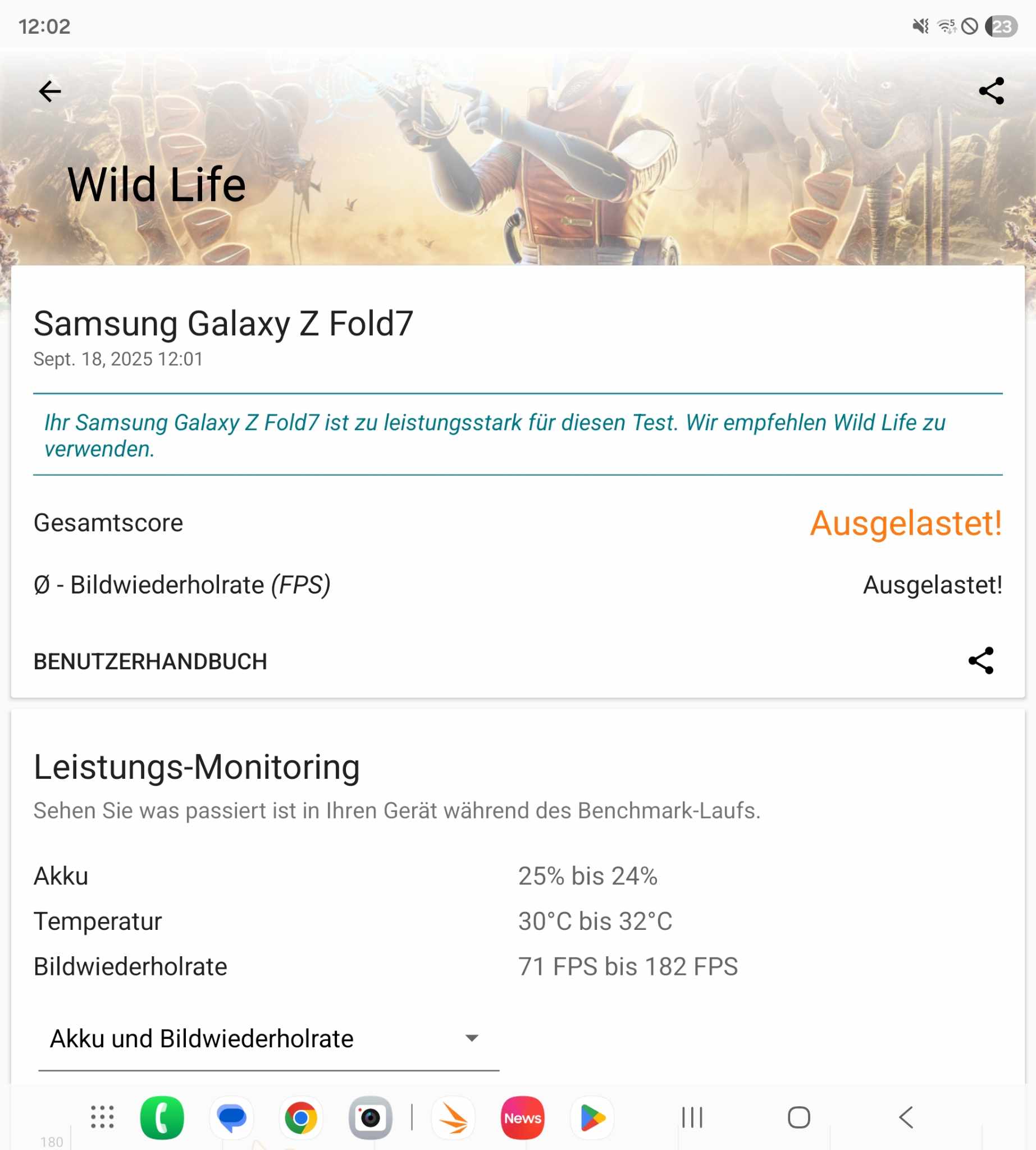 Ebenso spürbar ist das thermische Verhalten. Im Kurztest laufen die genannten Spiele konstant flüssig, doch nach rund zehn bis fünfzehn Minuten Dauerlast tritt spürbares Throttling an der oberen Leiste ein. Die Leistung wird notfalls automatisch heruntergeregelt, die Bildrate sinkt, und das Display reduziert bei starker Erwärmung sogar die Helligkeit. In der Praxis bedeutet das: Während kurze Sessions im Alltag nahezu ideal wirken, kommt das Fold 7 bei ausgedehnten Gaming-Abenden ins Schwitzen. Dies ist weniger ein Versagen der Hardware, sondern eine zwangsläufige Folge des ultradünnen Designs, das kaum Raum für ausgefeilte Kühllösungen bietet. Hier trifft Design auf harte technische Realität. Klassische Gaming-Smartphones mit integrierten Vapor-Chambers oder gar aktiven Lüftern haben hier einen Vorteil, doch diese sind sperriger und verzichten auf den spielerische Kinkerlitzchen wie den Faltmechanismus.