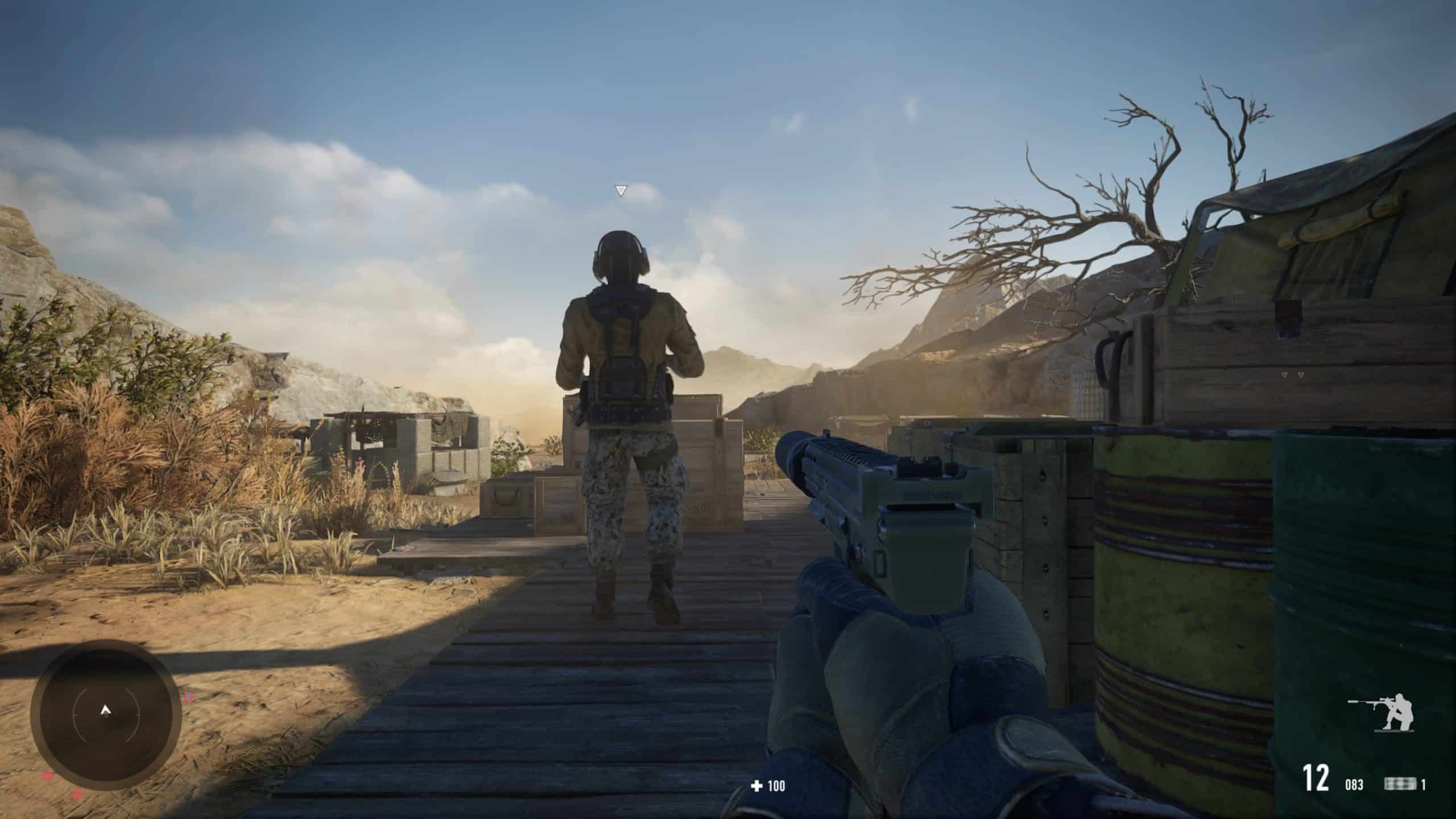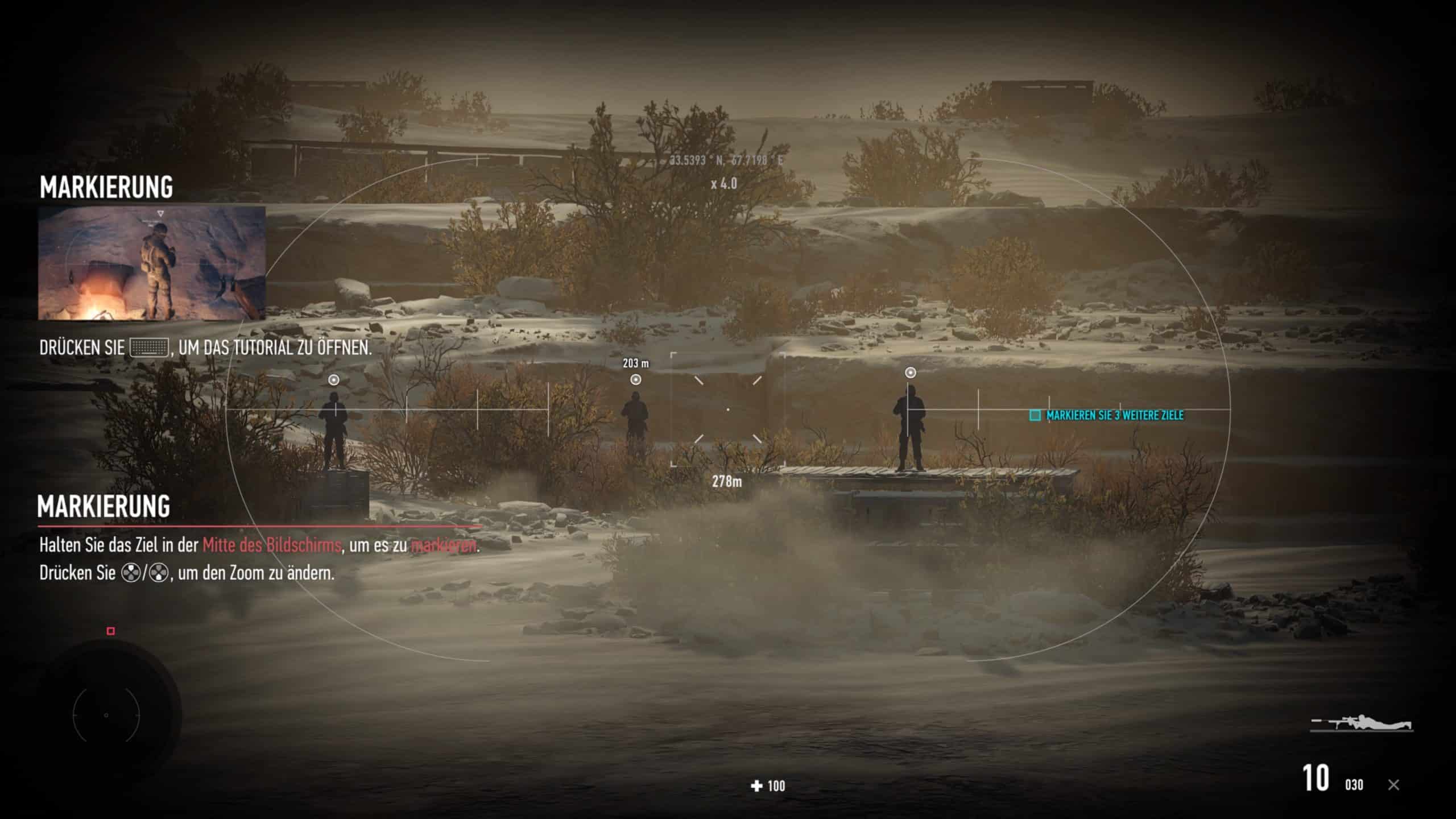 Einerseits ist natürlich löblich, dass sich CI Games in Sachen Präsentation heutzutage auf den Stand von Call of Duty in Jahr 2014 begibt. Verwackelige Videoaufnehmen, hektischer Zoom auf schwarz-weiß Fotos, finster dreinblickende Kriminellen. Alles vorhanden. Aber wieso hören wir zum gefühlt zum 1799. Mal die gleiche einfallslose „Terrorstaat mit Weltherrschaftsplänen“-Backstory? Vermengt mit Antagonisten aus der Klischeetonne – hier die intregante Staatschefin, dort ein waffenverliebter General oder der Bruder eines Cousins, der in Öl macht. Hier heiligt eher der Zweck die Mittel. Keine Sorge, insgesamt spielt sie eine untergeordnete Rolle. Sobald wir mit Raven das ausführliche Tuturial durchliefen, geht es ohne Umschweife direkt in eine felsige Wüstenregion. Für das nötige Spielgefühl tastet sich Sniper Raven, gänzlich ohne Vorgeschichte ausgestattet, durch kleinere Zelt-Städte zum Auftragsziel vor. Die Wahl, ob wir ruhig per schallgedämpfter 9mm-Pistole oder gleich geschickt jeden Fein wegsnipern bleibt uns überlassen. Das Studio designte die Gebiete erfreulich reizvoll damit wir abseits des Hauptweges erkunden – simple Klettereien inklusive. Neben kleineren Goodies lassen sich auch bessere Sekundärwaffen wie halbautomatische Gewehre finden.