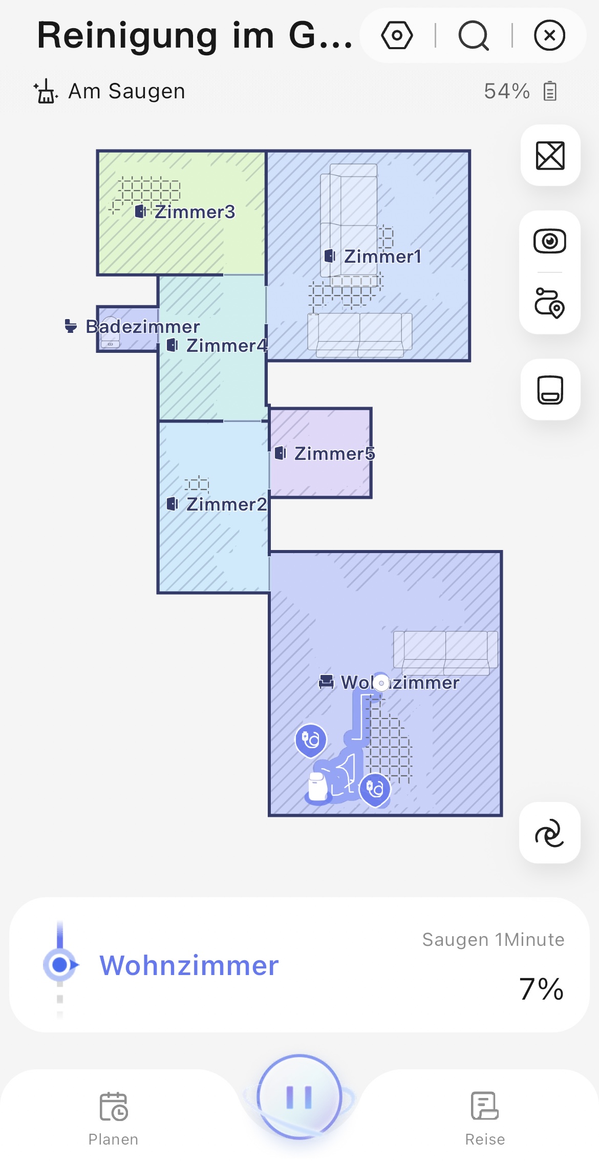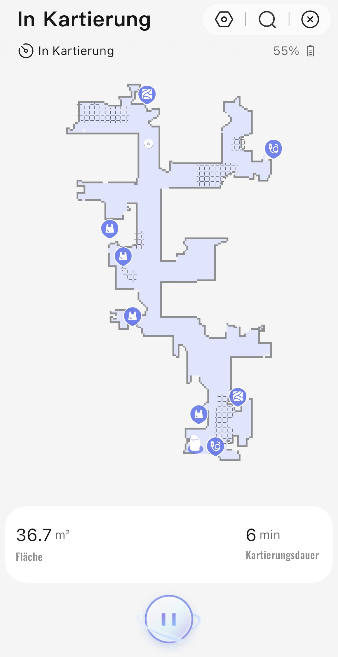 Die Einrichtung erfolgt über die Narwal-Freo-App, kostenlos erhältlich für iOS und Android in den jeweiligen Stores. Innerhalb weniger Minuten ist der Flow mit dem WLAN verbunden, schon bei der ersten Fahrt kartiert er selbstständig die Räume in verblüffender Geschwindigkeit. Anders als viele Konkurrenten wie Roborock oder MOVA fährt er nicht jede Ecke ab, sondern erstellt intelligent eine Karte auf Basis von Kameras und Lidar-Sensoren. Das Mapping ist so schnell, dass man den Eindruck bekommt, der Roboter „weiß“ bereits, wie die Wohnung aufgebaut ist. Die App selbst ist logisch strukturiert, bietet eine klare Raumübersicht, Zonen- und Sperrflächenverwaltung sowie verschiedene Intensitätsstufen für Saug- und Wischleistung. Positiv: Auch Einsteiger finden sich sofort zurecht. Nur ein paar mäßige Übersetzungen fallen lapidar auf.
