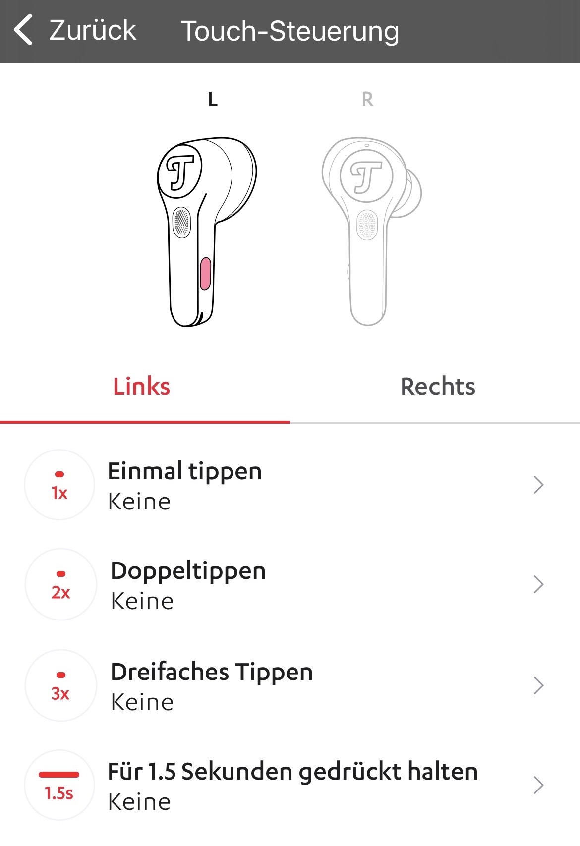 Die kostenlose Teufel-Go-App gehört zu den stärkeren Argumenten des Systems. Die Verbindung erfolgt dank Fast Pair schnell und zuverlässig, danach stehen umfangreiche Einstellmöglichkeiten bereit. Neben ANC und Transparenzmodus gibt es mehrere Klangprofile: Neutral (ohne DSP-Eingriff), Bass-Verstärkung, Podcast, Techno, Pop, Höhen-Anhebung, Rock, Klassik sowie ein frei konfigurierbares „Mein Preset“. Zusätzlich lassen sich bis zu sieben Funktionen auf die Tasten der Ohrhörer legen. Genau hier zeigt sich allerdings der größte Schwachpunkt der Hardware: Statt Touchflächen setzt Teufel auf mechanische Drucktasten mit kaum spürbarem Druckpunkt. Millimetergenaues Drücken mit Fingernagel oder wahlweise Fingerspitze ist nötig, Mehrfachklicks werden zur absoluten Geduldsprobe. Gegenüber den hervorragend funktionierenden Touch-Bedienungen der Konkurrenten Apple oder JBL wirkt dieses Konzept aus der Zeit gefallen. Praktisch bleibt daher oft nur der Griff zur App – hier müssen die Berliner beim nächsten Modell dringend nachbessern.