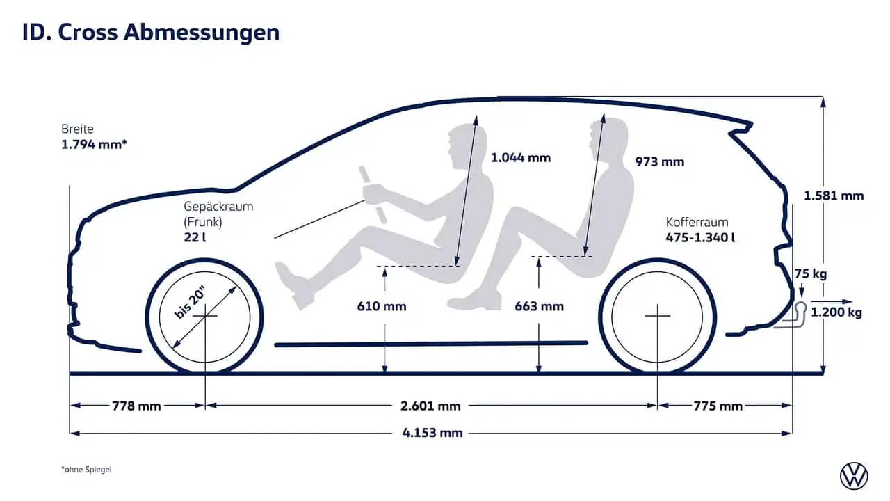 Der ID. Cross ist als Fünfsitzer geplant und nutzt Volkswagens neue Designsprache, die der Hersteller als klar, ruhig und wertig beschreibt. Laut VW soll das Modell kompakte Außenmaße mit gutem Raumangebot, modernen Assistenzsystemen und einer alltagstauglichen Elektroplattform verbinden. Noch handelt es sich um ein seriennahes Konzeptfahrzeug, also nicht um die endgültige Verkaufsfassung.