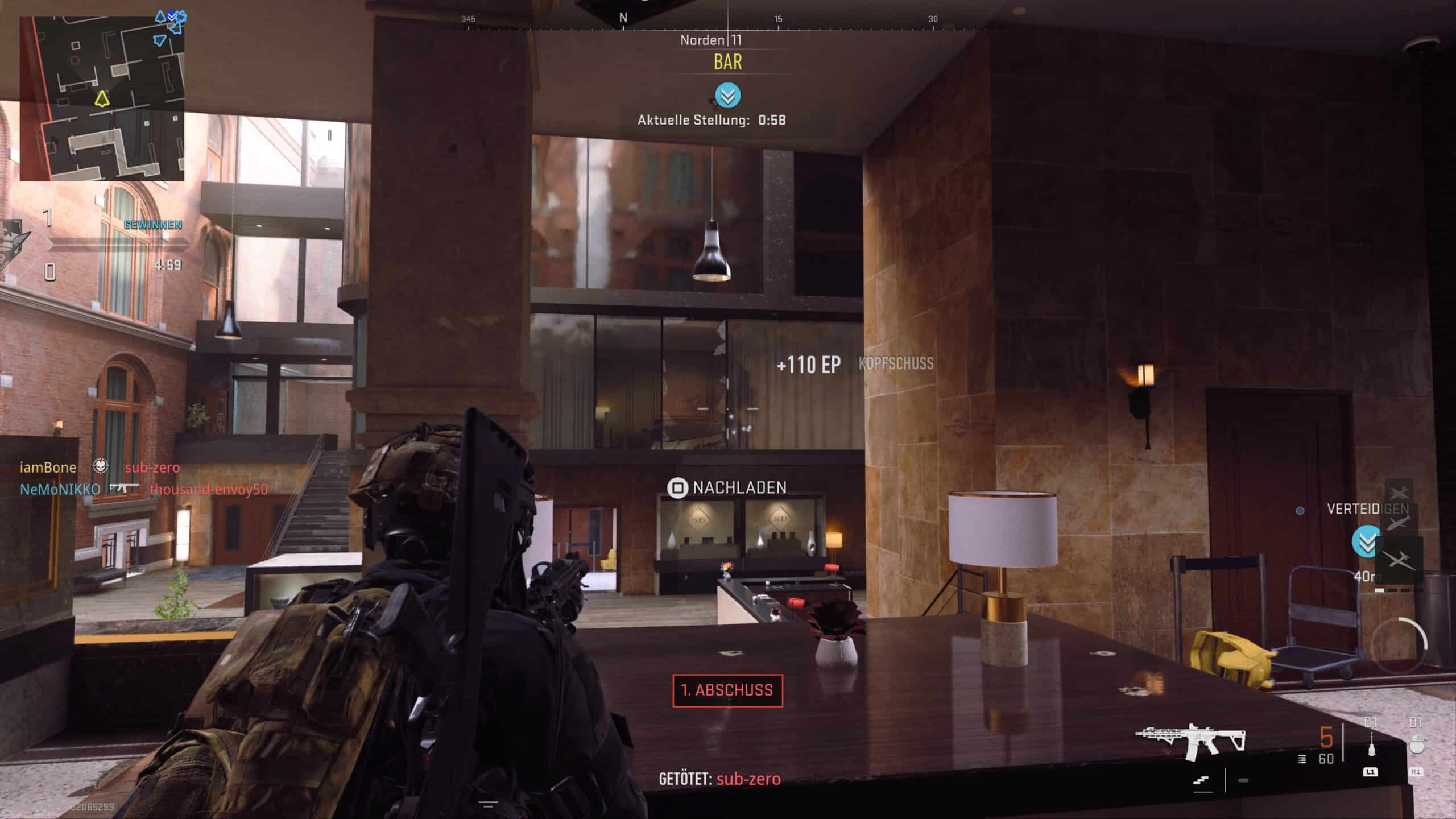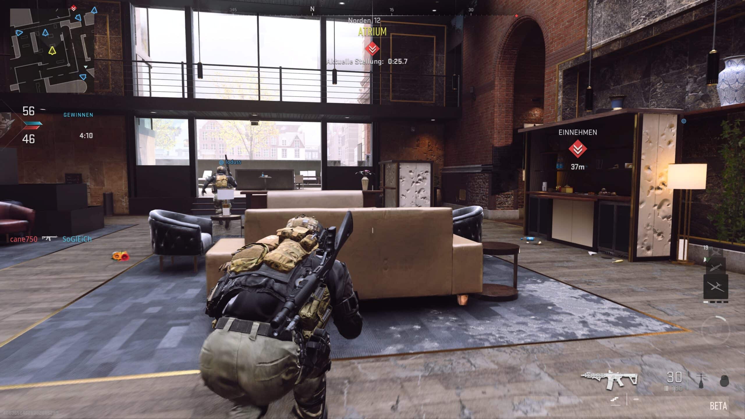 Im reinen Gameplay fällt sofort das Back-to-the-Boots-Gunplay seitens Infinity Ward und Raven Software auf. Wie schon im gelungenen Reboot vor drei Jahren entscheiden Taktik sowie letztliches Können über Sieg oder Niederlage. Obligatorisch startet jeder Spieler mit dem gleichen Waffen-Set bestehend aus jeweils einem Schießeisen aus einer Kategorie. Zur Auswahl stehen Maschinengwehre, MP’s, Schrotflinten oder auch schwere Kaliber. Durch Kills verbessern wir unser Setup. Daneben gibt es kleinere Sekundärwaffen, wobei ich nicht verstehe weshalb einige nicht anwählbar waren. Zur weiteren Ausrüstung gehören Granaten, Thermit und selbstverständlich freischaltbare Goodie wie Munition bei erledigten Gegnern zu sammeln. Die brandneuen Maps hinterlassen einen teils schalen Geschmack – während sich Lobby’s nach Spielende komplett auflösen passiert es schon mal eine Map drei Mal am Stück sehen zu müssen. Negativ fiel Valderas Museum auf – viel zu lange Gänge treffen auf offene Flächen ohne viel Deckung. Zumal, Museum-typisch, alles karg ausschaut. Fetziger sind immerhin die drei weiteren Karten: Breenbergh Hotel, Farm 18 und Mercado Las Almas. Allesamt eher winklig gehalten. Zudem mit unterschiedlichen Settings spielend.