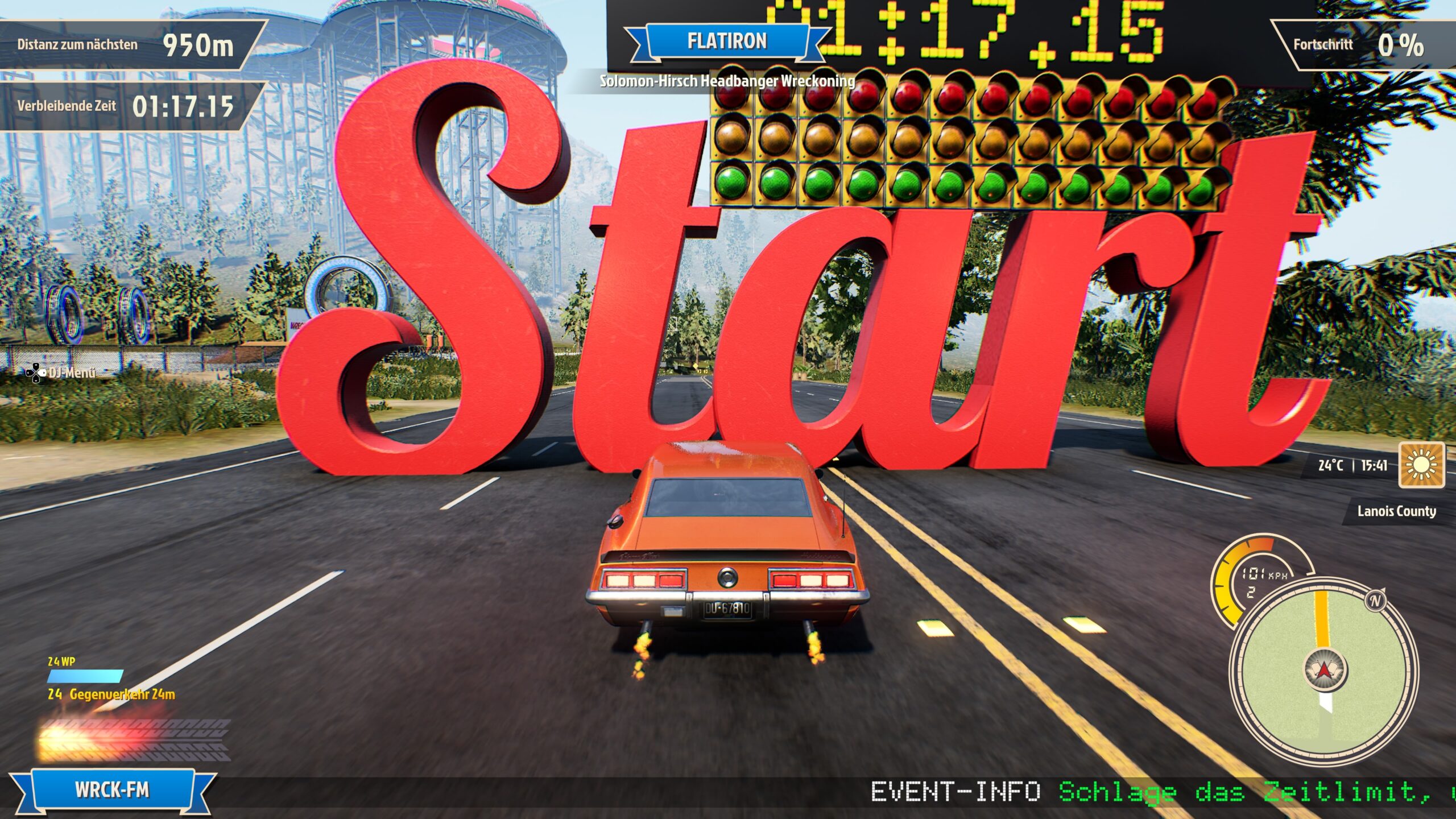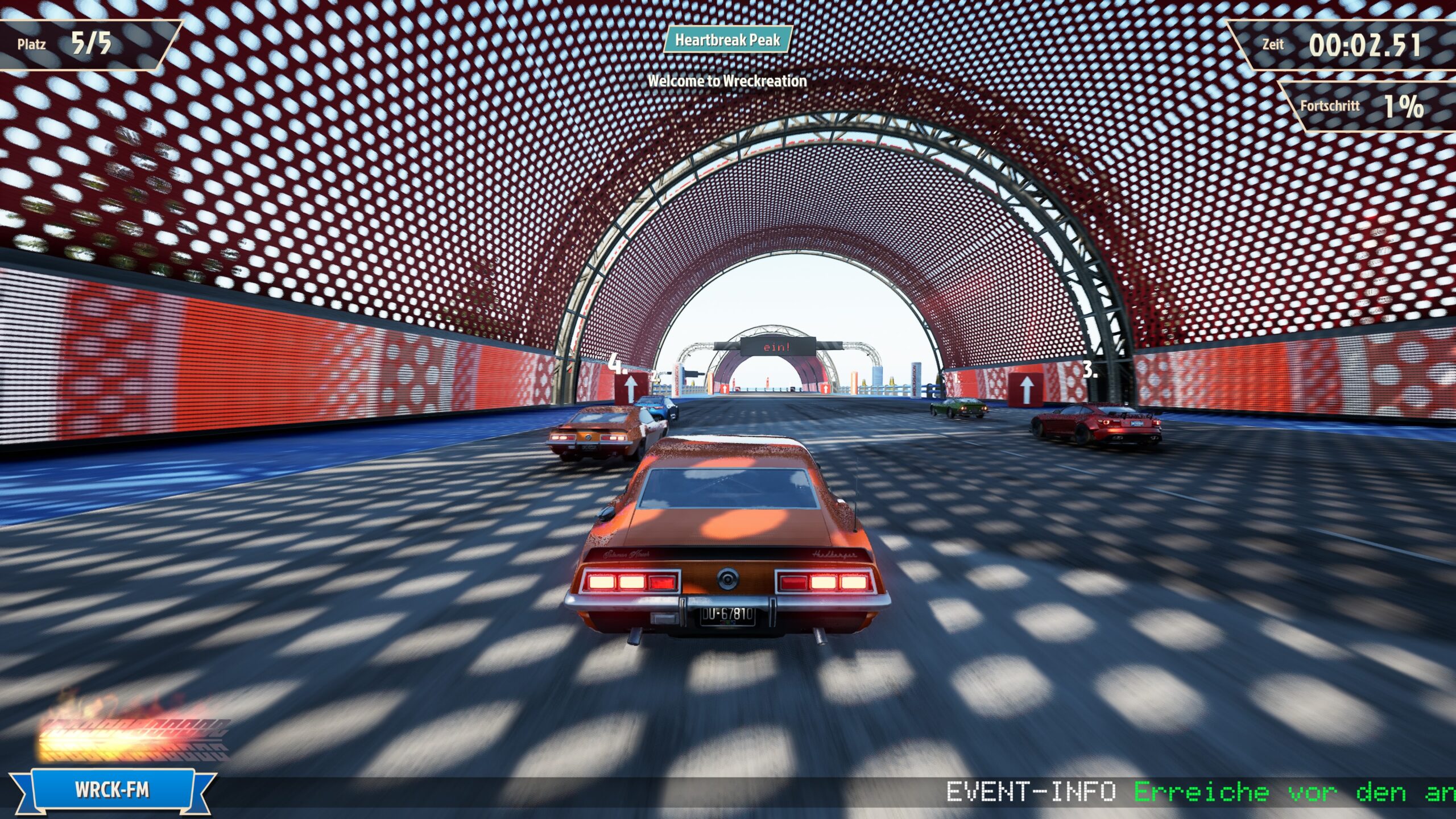 Das Fahrgefühl selbst ist solide, wenn auch nicht fehlerlos. „Wreckreation“ will Arcade sein, aber das Driften fühlt sich zuweilen schwammig an, als würde man auf einer öligen Fläche schlittern. Kollisionen dagegen sind eine Wucht – im besten Sinne. Wenn man durch ein Checkpoint-Schild rast, das tatsächlich das Wort „Checkpoint“ in den Asphalt meißelt, fühlt sich das fast wie eine Parodie auf die eigene Genre-Herkunft an. Diese ironische Brechung, dieses Augenzwinkern, ist ein kleiner Triumph: Hier weiß jemand genau, welche Klischees er bedient.