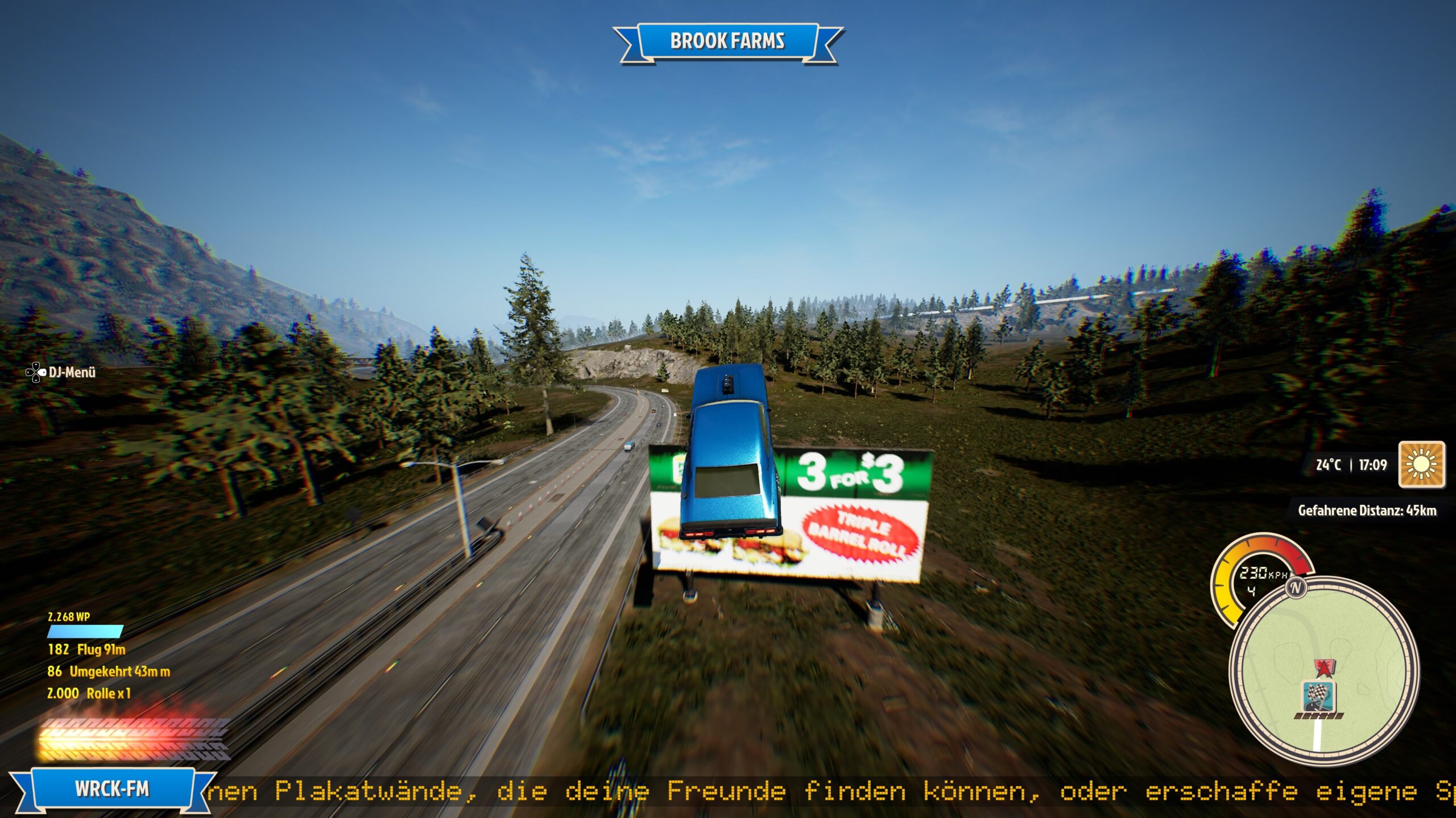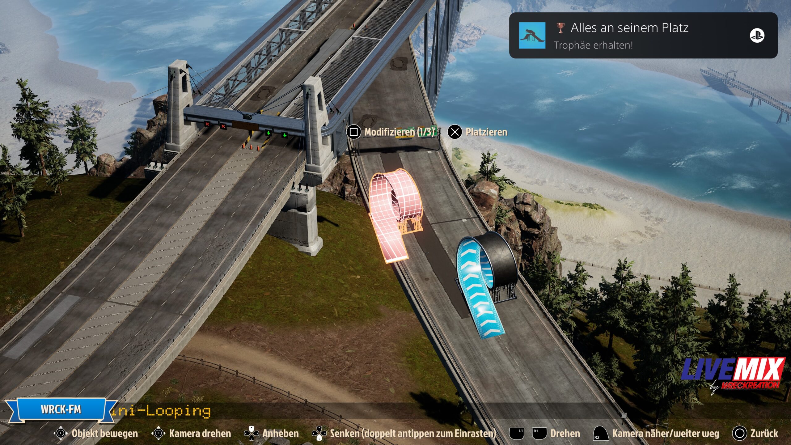 Denn das Herzstück von „Wreckreation“ hört auf „Live Mix“. Mit einem Druck auf das Steuerkreuz links öffnet sich ein Menü, das einem wortwörtlich die Kontrolle über die Welt gibt: Wetter, Tageszeit, Verkehrsdichte – alles lässt sich in Echtzeit verändern. Quasi wie in einer Mod. Und natürlich darf man bauen: Rampen, Loopings, Tunnel, Skytracks, die in waghalsigen Spiralen in den Himmel wachsen. Wer will, pflastert die Landschaft mit Sprungschanzen oder platziert brennende Reifenringe mitten auf der Autobahn. Doch so spektakulär das klingt – in der Praxis ist der Editor nicht frei von Reibung. Bauteile müssen zunächst gefunden werden, und sie liegen in der Welt verstreut wie Sammelobjekte eines Sammelwahnsinnigen. Manche erreicht man nur, wenn man zuvor selbst eine Rampe baut, groß genug, um an das begehrte Stück zu kommen. Wer hier Geduld und ein gutes Auge mitbringt, wird belohnt – alle anderen fluchen leise.